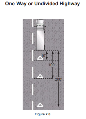 Commercial truck drivers are trained on the placement of the warning devices from the time they first get their commercial driver’s license (CDL) permit. Colorado’s CDL Manual outlines how the warning devices are to be placed:
